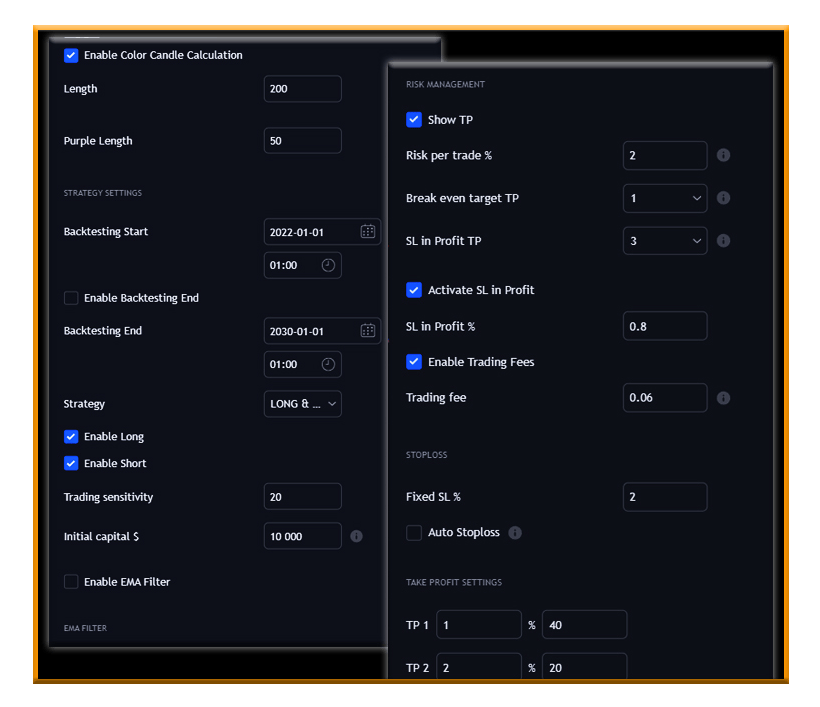Choose your risk management such as take profits, SL to break even, SL in profit, trading fees,…